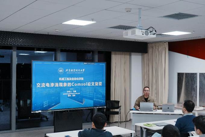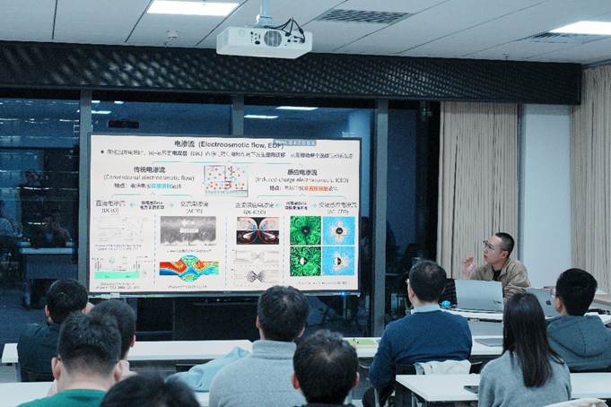 随后,王傲以“交流电渗流现象的Comsol论文复现”为主题进行分享。他以交流电渗流现象为研究对象,详细介绍了在对称电极与不对称电极分布条件下,微流道内流体流动特性的差异,并系统讲解了交流电渗流的基本物理机理、仿真所涉及的理论公式及边界条件设置方法。通过多物理场仿真软件Comsol的实机演示,完整复现了相关论文中的仿真过程,生动展示了专业物理现象从理论到数值实现的全过程。