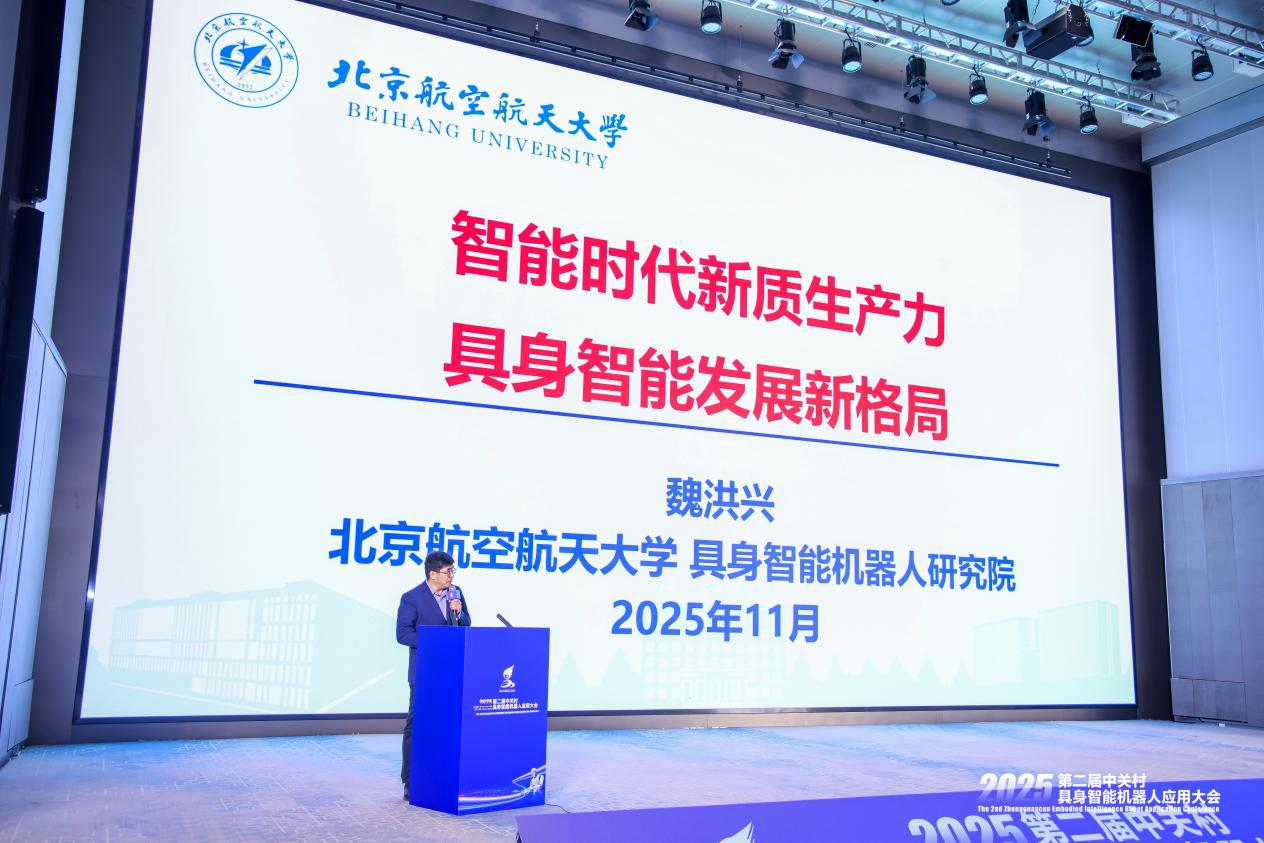 在大会主旨报告环节,北航具身智能机器人研究院经理魏洪兴教授发表了题为《智能时代新质生产力 具身智能发展新格局》的演讲。报告系统阐述了机器人技术迈向具身智能时代的发展新格局与实现路径,分享了北航在该前沿领域的战略思考。