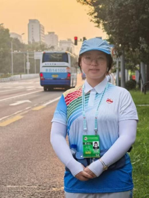 在本次活动中,她始终全心投入,活动前完成了包括“活动精神思想、岗位职责理论、专业服务礼仪”等全方面的系统培训,培训时间长、内容全。除此之外,她积极报名参与深夜演练,不论天气晴雨,均从当日中午开始待命,次日凌晨才返回校园,确保正式活动顺利进行。在正式活动当天,她深夜3点到岗准备,中午12点服务结束返程,在服务过程严格遵照从前培训和演练的要点要求,完成本职任务的同时做到热情、微笑服务。见证首都最深的夜,也陪伴首都最早的晨,真正做到在坚守中奉献自我,将“小我”融入“大我”。