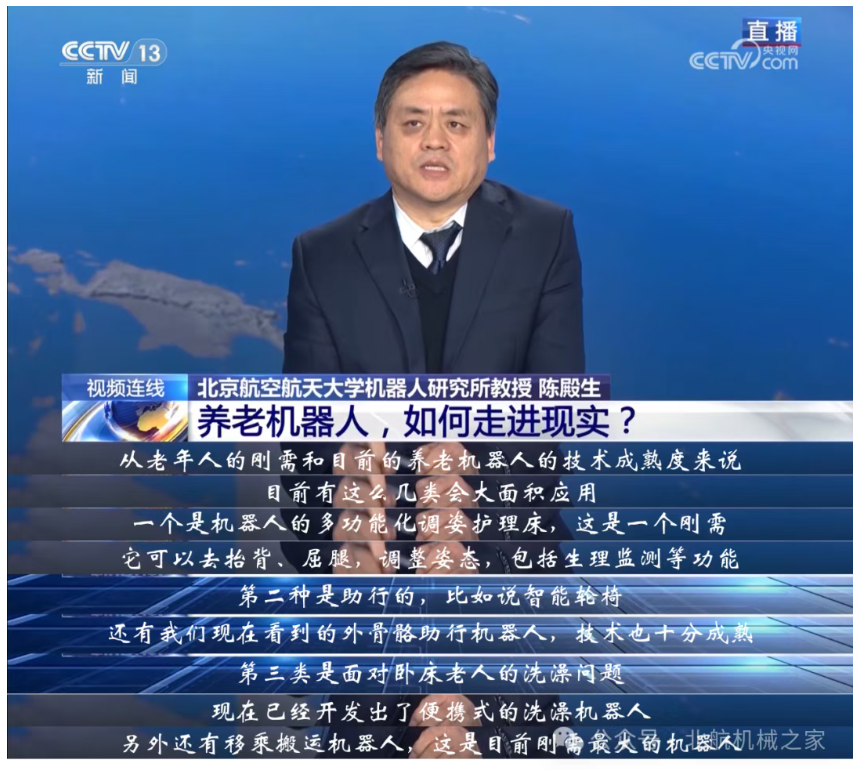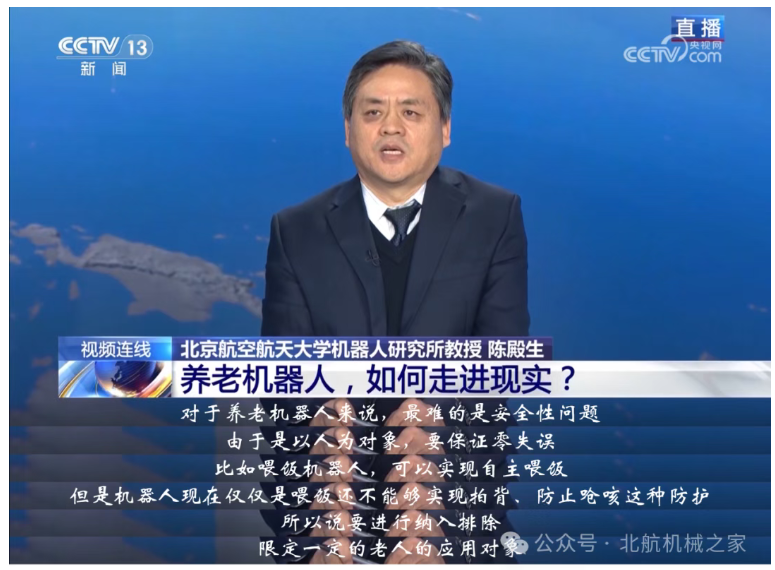 近日,中央电视台新闻频道(CCTV-13)《新闻1+1》栏目以“养老机器人,如何走进现实?”为题,对养老机器人相关议题进行了深入报道。公司陈殿生教授受邀接受采访,就养老机器人的应用现状与发展前景作出专业解读。