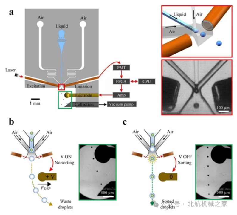 单细胞是人体组织器官的基本构成单元,针对传统生物打印技术不能稳定可控打印单细胞的技术瓶颈,提出了微流控分选打印单细胞概念(图2),发明了气流中的单细胞介电泳分选技术,在毫米级微流控芯片上实现打印头的设计制造,相较于传统打印技术大幅度提高了单细胞打印位置精度和打印速度,打印精度达到10  μm,打印速度达到100 Hz。