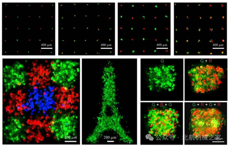 多细胞微组织能在体外模拟人体疾病,是高通量药物筛选的理想载体。针对传统细胞打印制造多细胞微组织均一性不足、可重复性差等问题,建立逐细胞打印制造单细胞级细胞阵列、二维细胞图案及三维异质微组织的工艺方法,体外构建了能够模拟人体肝纤维化的微组织疾病模型,实现了多级微组织的单细胞级精准制造(图3)。