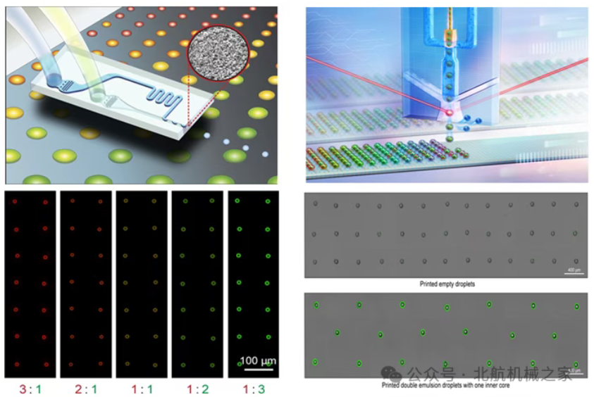 针对传统液滴微流控打印精度低、材料单一等问题,提出以超疏水限域液滴喷射方法,进一步提升了液滴打印精度,实现了目前微流控液滴打印的最高精度3   μm;提出微流控芯片流道浸润图案化工艺,实现微流控打印头内的多级乳液可控生成,通过实时检测与介电泳分选实现了空气中的多材料乳液液滴按需分选打印(图1)。