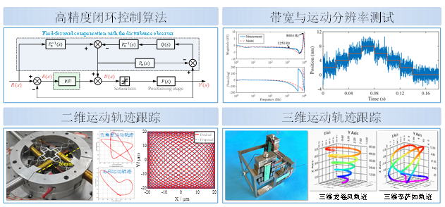 高精度闭环控制是实现微纳结构高效高质制造的重要技术。为解决传统控制算法存在精度低、响应慢、鲁棒性差等问题,开发了“动态驱动-在线感知-实时补偿”一体化闭环控制技术,实现了运动分辨率5 nm的多自由度任意运动轨迹追踪控制,如图2所示。
