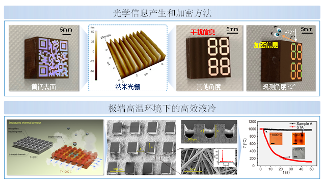 基于光栅衍射原理,提出了纳米光栅阵列诱导的光学信息产生和加密方法,实现了超精密加工技术在信息科学领域的应用。针对Leidenfrost效应带来的热学瓶颈难题,基于微柱阵列设计了柔性结构热装甲,实现了极端高温环境下的高效液冷,为解决我国航空航天领域高端设备的高温散热难题提供了新思路。