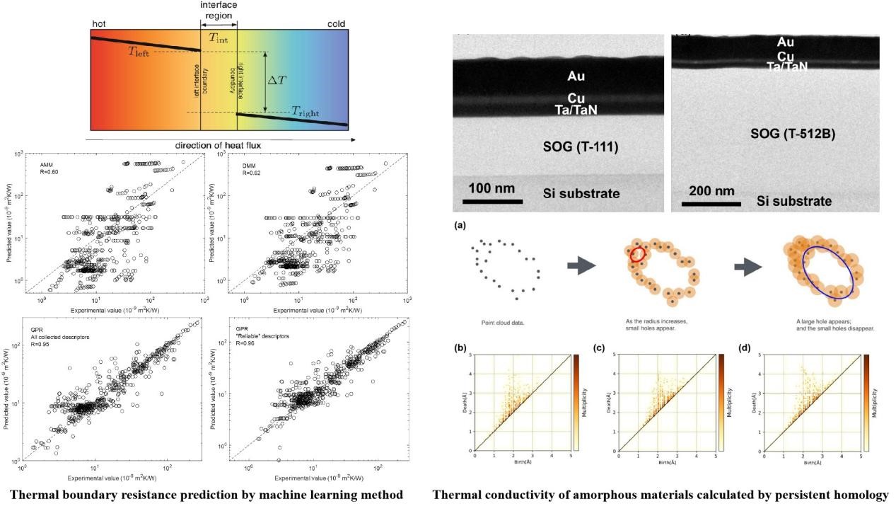 传统界面热阻预测方法依赖简化模型和经验参数。本研究利用机器学习手法深度融合材料属性、界面特性等多维物理特征,挖掘其与界面热阻间的复杂非线性关系,实现了界面热阻更快速、更高精度的预测。由于缺乏长程有序性,非晶材料的结构特征难以表征,这阻碍了其结构-性能关系的确定。本研究利用持续同调方法将无序原子结构中的多尺度“孔洞”结构量化为拓扑特征,并关联其与声子的输运行为。通过分析这些拓扑特征的“生命周期”,揭示了原子团簇的连通性与稳定性如何影响热导率,从拓扑无序的角度阐释了导热机制。