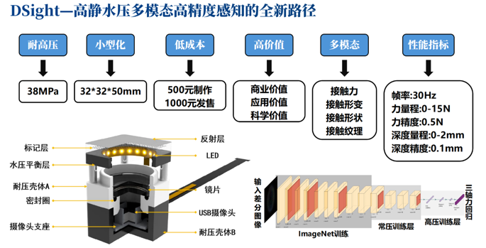 项目简介:近年来,随着海洋强国战略的持续推进,深海科技正成为前沿竞争的焦点。本产品基于自研的DSight深海视触觉传感器,通过耐压结构设计,结合弹性体表面形变的光学视觉捕捉与深度学习算法,实现了3000m级实时高精度三维形貌重建、三轴力测量及动态位移场重建。其在高压环境下的深度重建精度达0.1 mm,法向力精度达0.3N,可应用于深海文物无损操作、工程维修等场景,为深海智能装备的感知与交互提供了创新解决方案。
